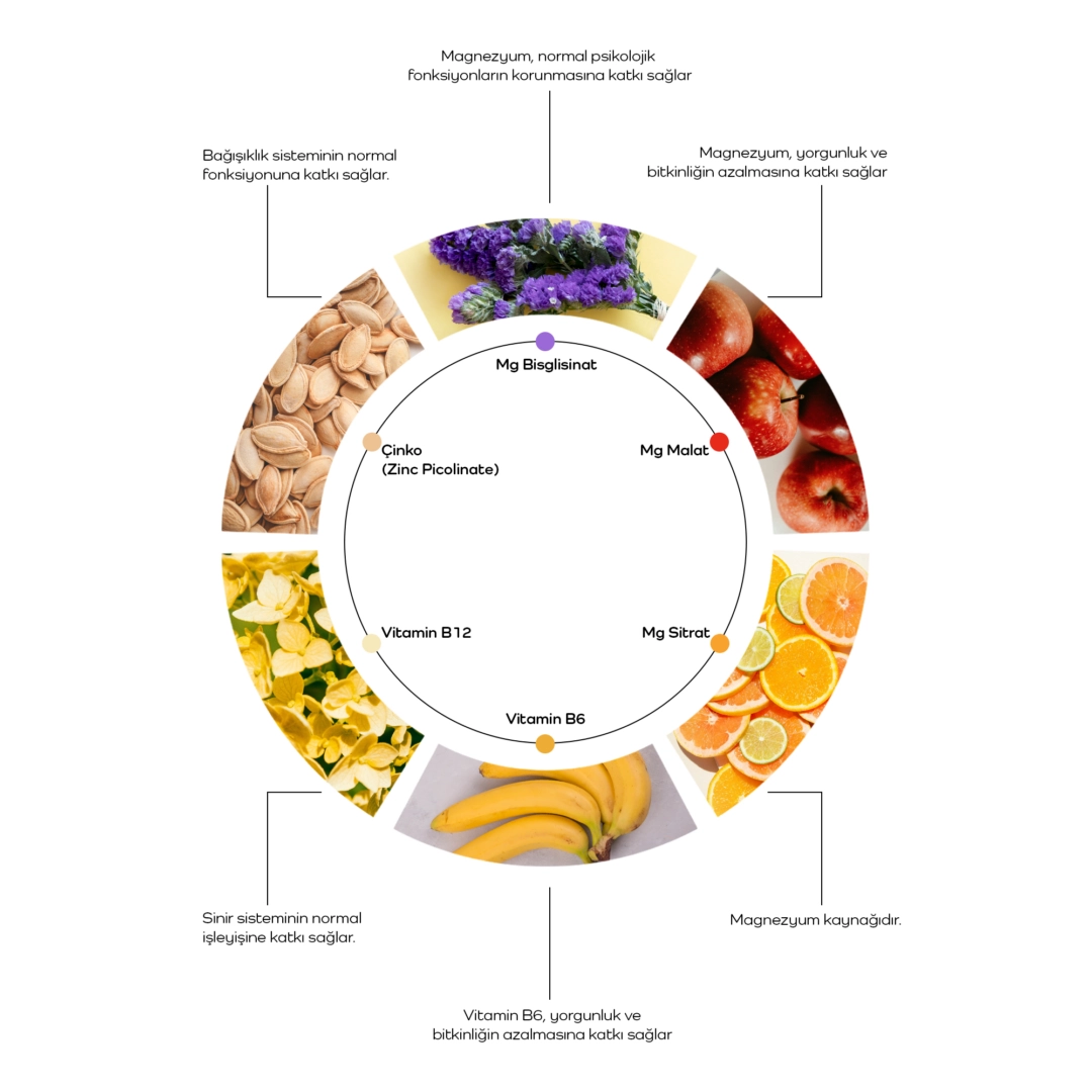 Bu üründe magnezyumun vücut tarafından en etkili şekilde kullanılmasını destekleyen sinerjik vitamin ve mineraller yer almaktadır: