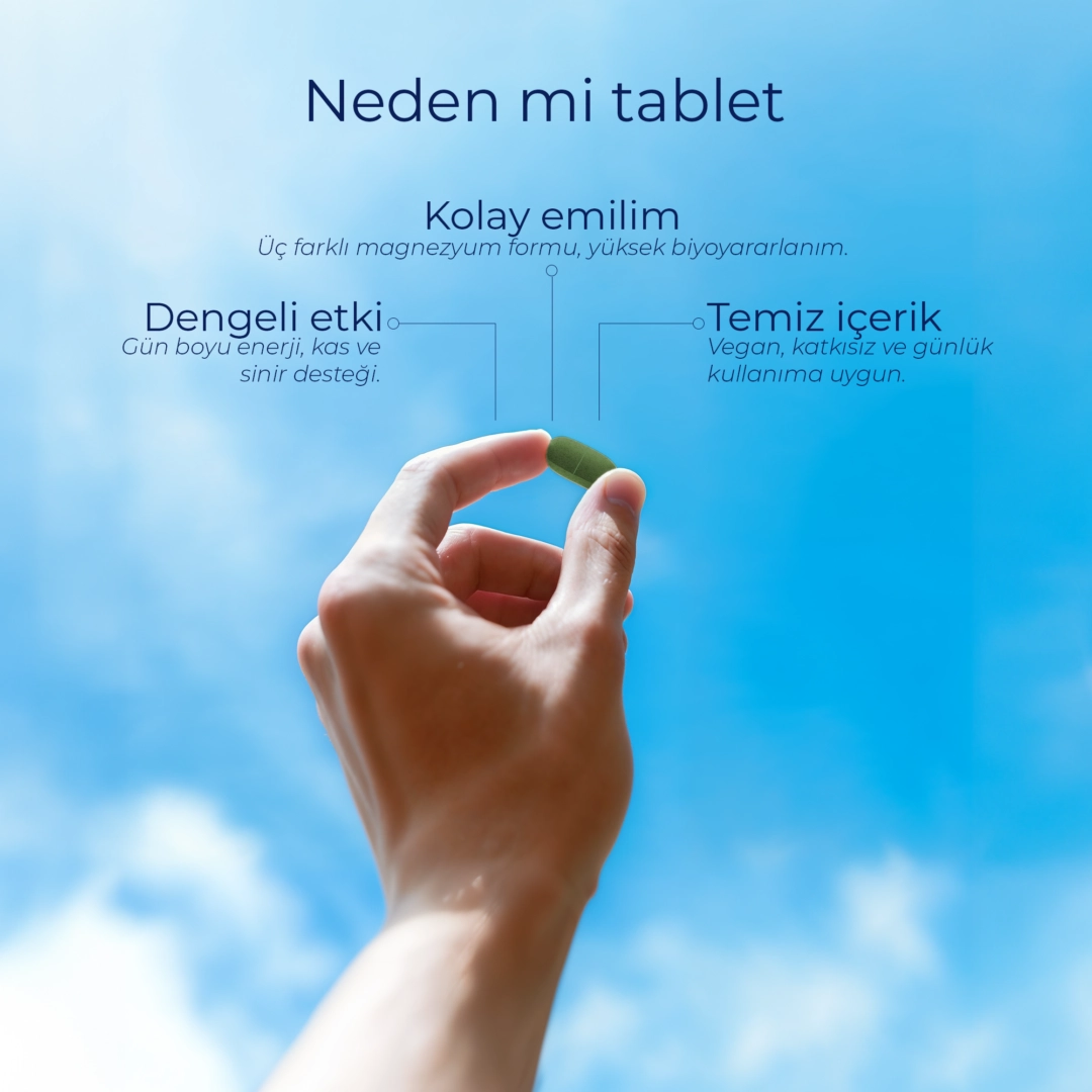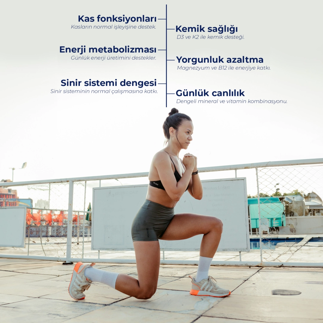 Bu ürün, bilimsel olarak en iyi emilen magnezyum formlarını (bisglisinat, malat ve sitrat) bir araya getirerek hem kas-iskelet sağlığını hem de sinir sistemini destekler. B6, B12, D3, K2 ve Çinko ile güçlendirilmiş formülü sayesinde magnezyumun etkinliğini ve biyoyararlanımını artırır. Sadece eksikliği gidermekle kalmaz, vücudun ihtiyaç duyduğu dengeyi günlük yaşamın temposuna uyum sağlayacak şekilde optimize eder.