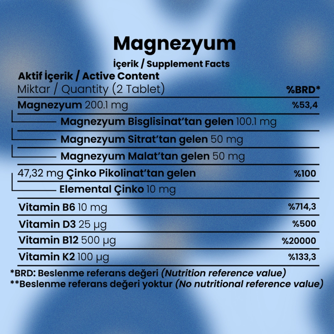 • Vitamin B12 (Metilkobalamin) – Sinir sistemi sağlığını destekler. Magnezyum ile birlikte hücre düzeyinde enerji üretimine katkıda bulunur.